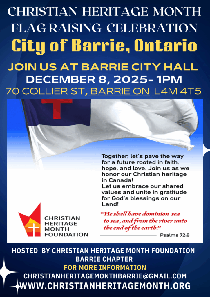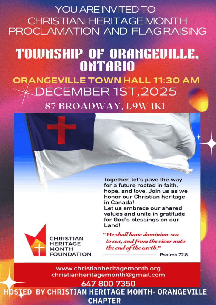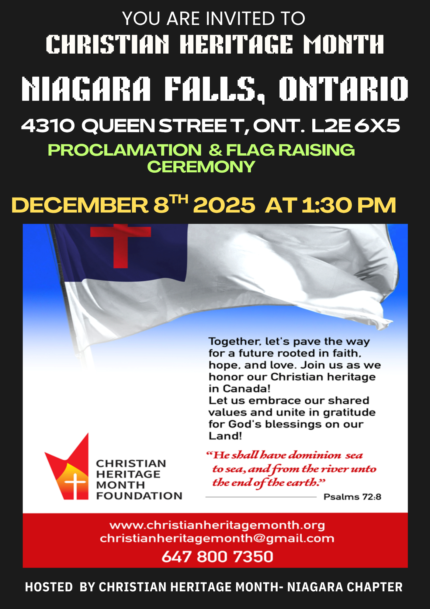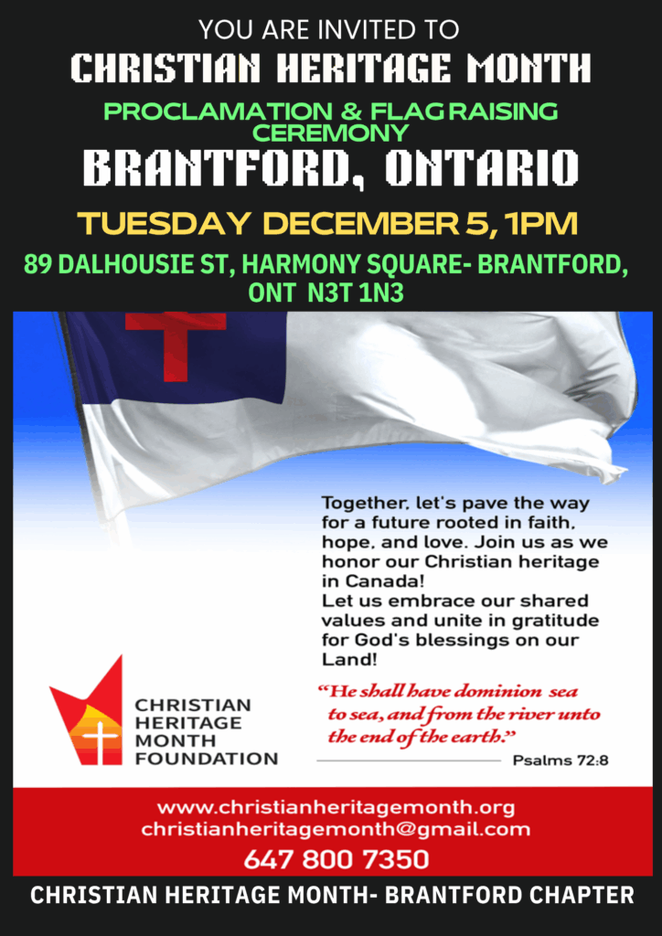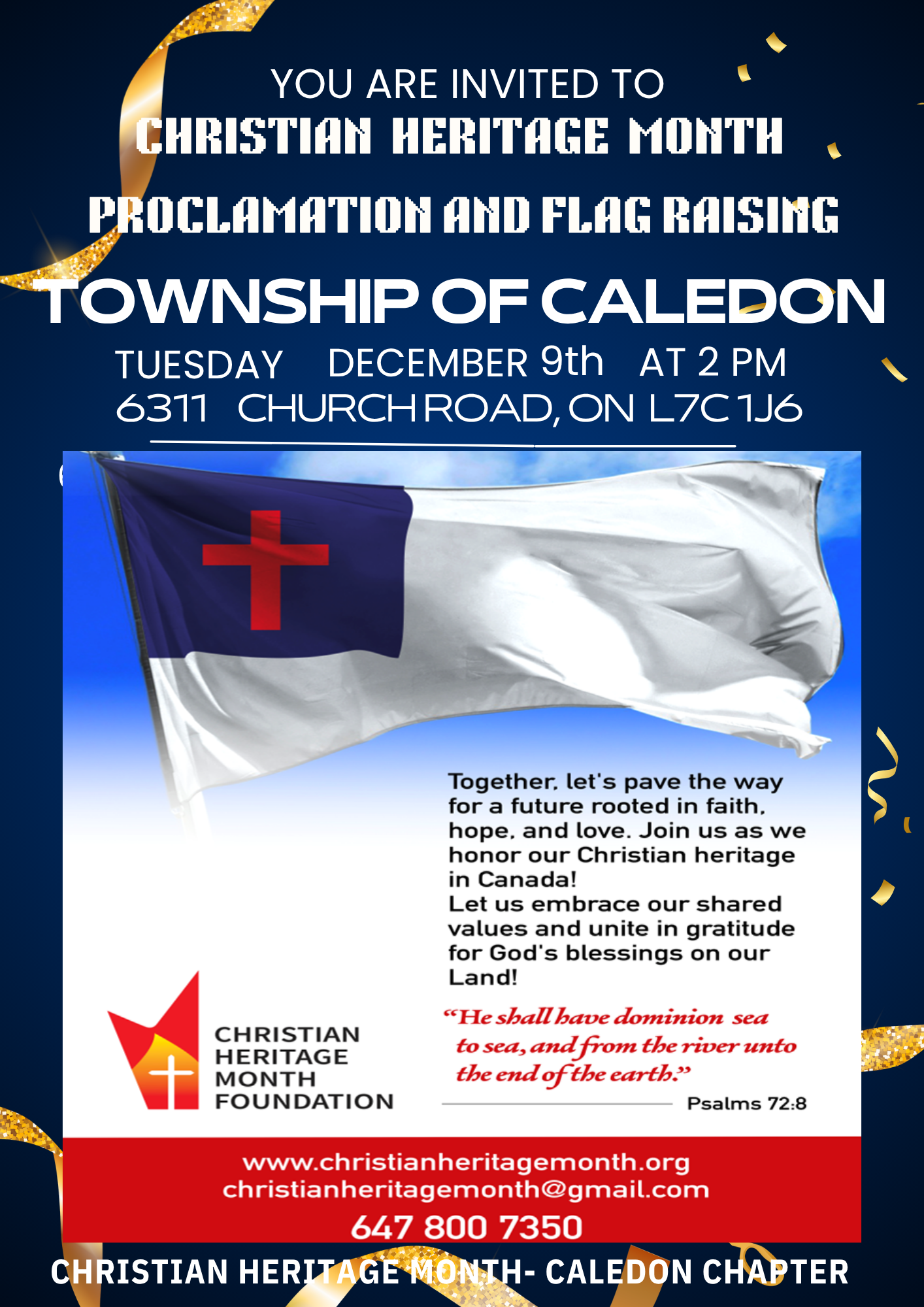 Canada Christian HeritageEach year Christian Heritage Month celebrations will commence with a Flag Raising Ceremony with Mayor and City Councillors on the first Sunday of December at Brampton City Hall from 4-6 pm with a Community outreach event.